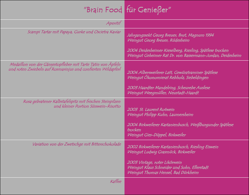 durch gutes Essen und passende Weine beflügelt. Den Abschluss der Veranstaltung bildete ein 4-Gänge-Menü, das mit den begleitenden